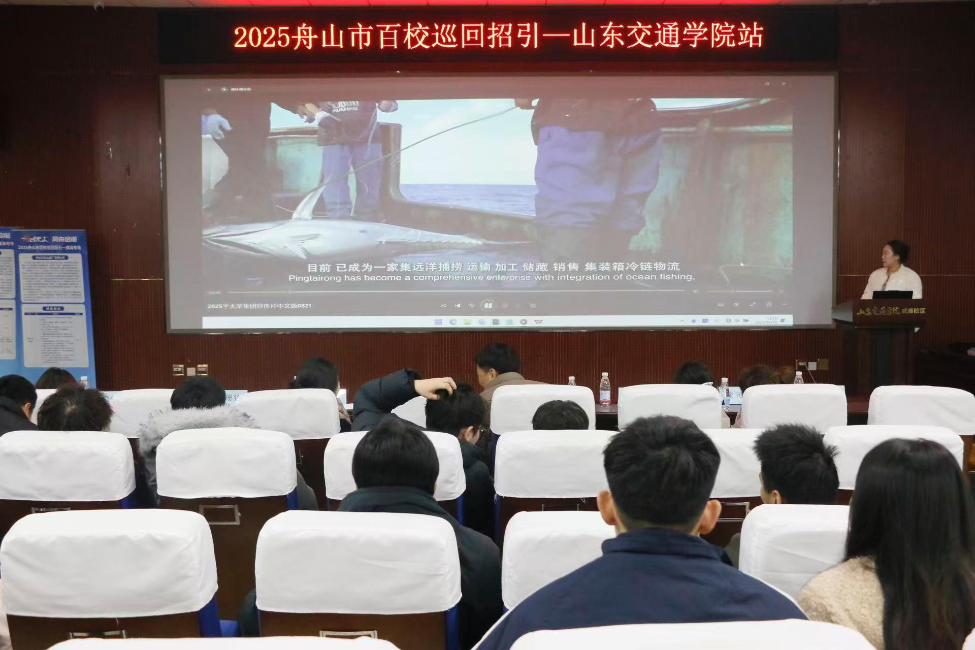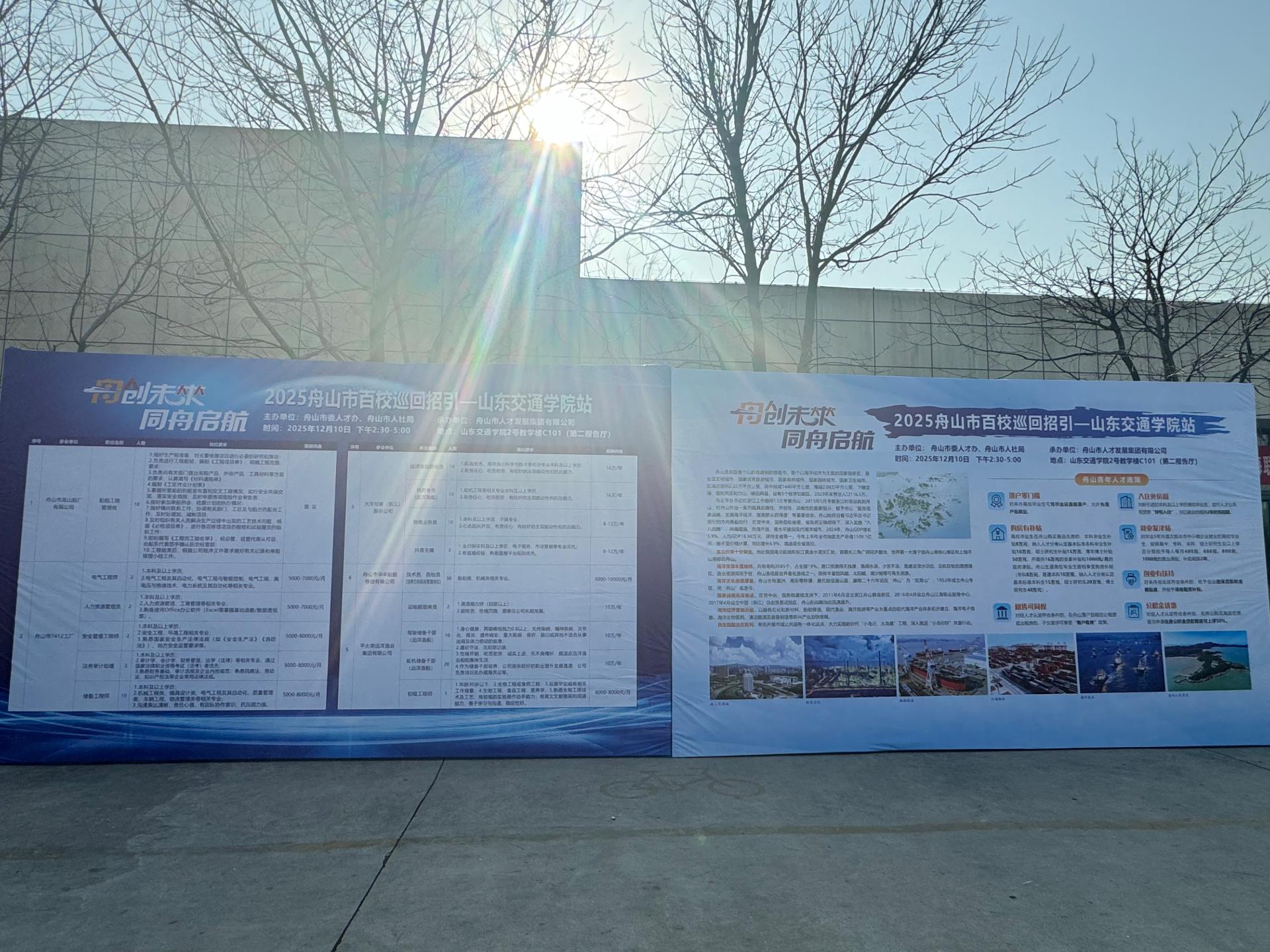 2025年12月10日,舟山市“百校巡回招引”行动——“舟创未来·同舟启航”山东交通学院专场招聘会在山东交通学院威海校区第二报告厅成功举办。本次活动由舟山市委人才办、市人社局主办,舟山市人才发展集团有限公司承办,旨在深化校政企三方交流合作,为我校毕业生提供更多优质就业岗位,助力毕业生实现更高质量的就业。